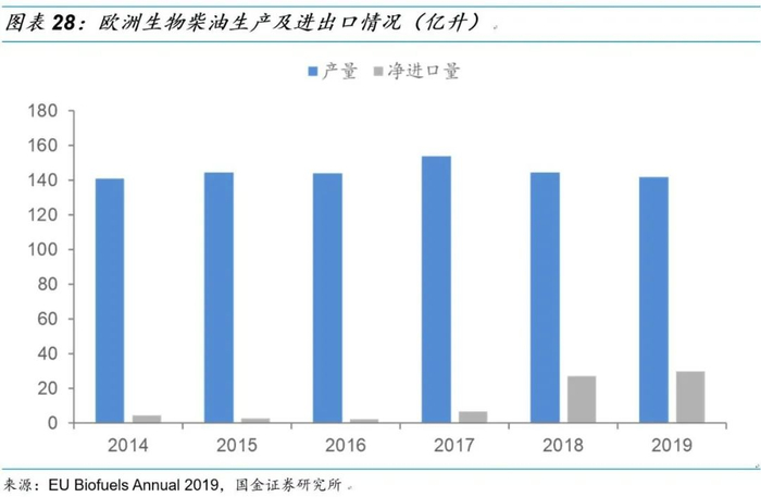 欧洲生物柴油供应缺口有望逐步放大,带动生物柴油进口需求提升。欧洲作为全球较为领先的生物柴油推广使用地区,产业链布局相对完善。根据《可再生能源指令》及修改版的要求,到2020年、2030年可再生能源消费比例分别达到27%和32%,其中可再生燃料在运输部门的占比需达到10%和14%。随着欧盟整体生物柴油添加比例的进一步提升,欧洲生物柴油产能将难以满足燃料添加需求,生物柴油缺口有望进一步放大,带动欧洲各国将持续进口生物柴油以满足碳减排计数要求。2019年欧洲净进口生物柴油约30亿升,进口量有明显提升,预期伴随着生物柴油缺口的放大,欧洲进口生产柴油需求还将进一步提升,为我国企业出口以废弃油脂生产的生物提供充足的市场空间。
