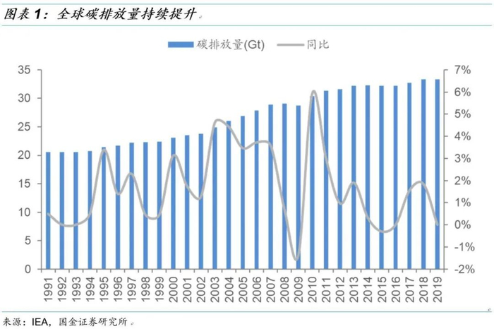 空气污染和大气问题引起全球重视。进入21世纪,在传统的环境问题治理基础上,大气问题也不断引起重视,由于温室气体的排放,全球变暖正在持续,根据IPCC预计从1990年到2100年全球气温将升高1.4℃—5.8℃。多年来全球碳排放总量持续提升,温室效应带来的冰川融化,海平面上升等一系列问题使得全球各国不断加强对温室气体排放的管控。而生物能源可再生、污染小,是燃料领域化石能源的主要替代产品。