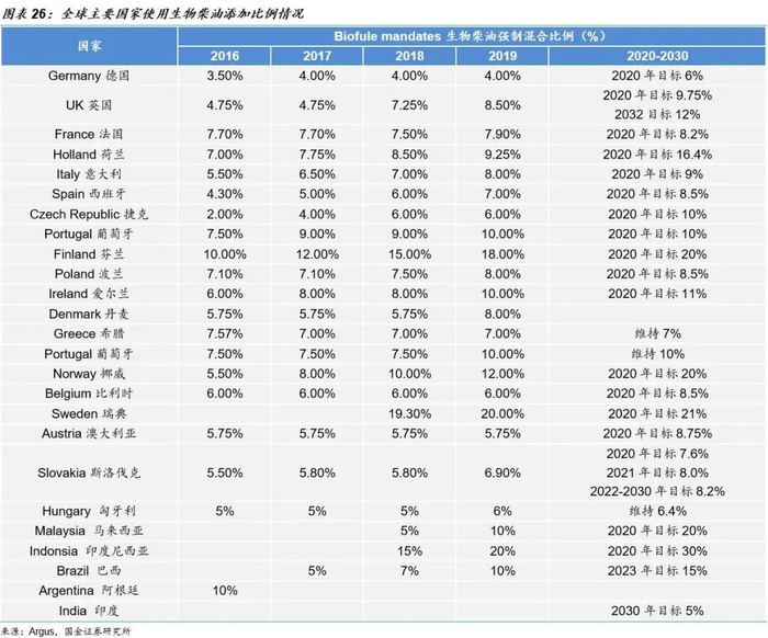 多国家提升生物柴油添加比例要求,带动生物柴油海外需求大幅提升。随着全球对于能源及环境气候问题的重视,众多国家都相继开始推行可再生能源使用以减少碳排放,其中生物燃料的推行是主要方向之一。至2019年底,全球有超过70个国家对传统生物燃料有混合授权,超过9个国家对生物燃料有授权或激励计划,超过24个国家对先进生物燃料有未来目标。