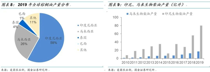 全球棕榈油生产高度集中,印尼、马来主要以棕榈油为原料生产生物柴油。由于油棕榈生长及产油量对温度、降雨量等要求较高,在全球分布较为集中,作为三大植物油的源头,棕榈油的生产高度集中,其中印度尼西亚和马来西亚合计产量占比高达84%,因而印尼和马来成为全球主要的棕榈油生产及出口基地,由于棕榈油资源丰富,印尼、马来以棕榈油为原料大量生产生物柴油,成为全球主要供给生物柴油的地区。