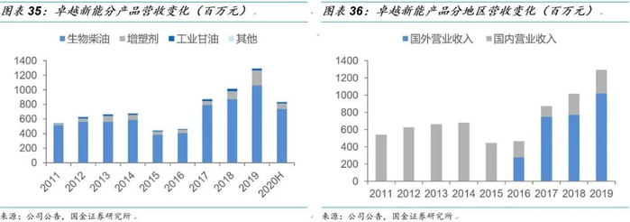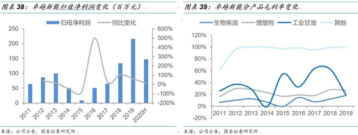 产业链延伸布局,构建能、化双线发展格局。公司多年来在废油脂产业链持续布局,在不断提升生物柴油技术工艺和生产规模的基础上,更是进一步进行了产业链的扩展延伸,以不同种类的生物柴油为原料生产增塑剂、工业甘油、水性醇酸树脂等产品,形成了4.4万吨增塑剂产能,2.8万吨工业甘油产能及3万吨醇酸树脂产能,伴随募投性项目投产,公司还将增加5万吨脂肪醇(酸)产能,公司在生物柴油的基础上,延伸产业链布局化工产品,形成能、化双线布局,在分散单一产品的波动风险的基础上,进一步提升公司产品的盈利空间。