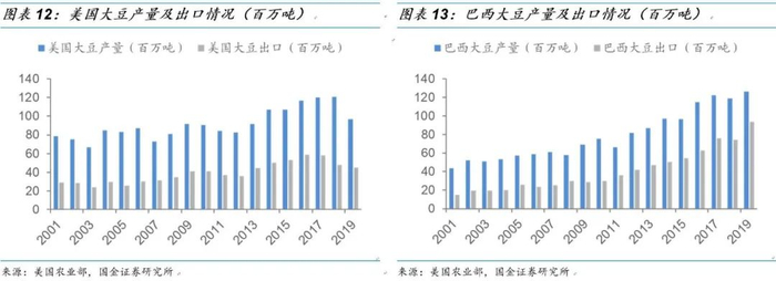 美国、巴西大豆原料充裕,主要以大豆为原料生产生物柴油。美国、巴西大豆作为油料供应充足,因而主要以大豆作为原料生产生物柴油。大豆提炼油脂后会有大量的豆粕等副产品,含有高蛋白,是良好的饲料来源,因而美国、巴西在满足自身需求后,主要以大豆产品出口为主。而美国和巴西以大豆为原料生产的生物柴油多数以自用为主,较少部分用于出口,形成了自给自足的原料、产品供应体系。
