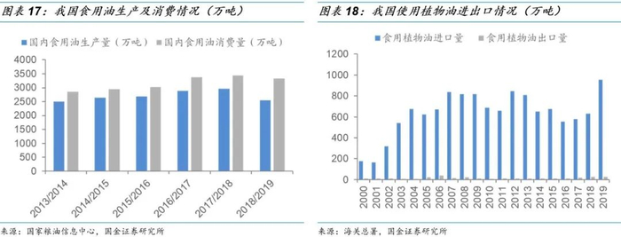 “不与人争粮”的政策要求使得国内难以形成以植物油作为直接原料的生物柴油产业链。不同于全球主要的生物柴油生产国,我国人口基数大,对于粮食及油品的需求量巨大,2018/19年,我国食用油产量2545万吨,仍有近800万吨的食用油缺口尚未自给,而在我国生产的食用油中,作为主要的油料的大豆仍长期依赖进口,2019年我国进口大豆8851万吨,产品自给率不足2成。国内油品尚未自给状态下,我国难以形成以传统油料为原料生产生物柴油产业链。