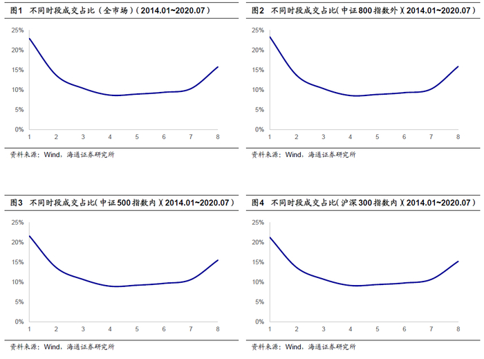 首先可使用2014年以来的分钟成交数据刻画股票在日内不同时段的成交占比。下图分别展示了全市场、中证800指数外、中证500指数内以及沪深300指数内的股票日内成交分布情况。