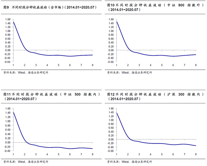 观察上图可知,股票收益波动的分布与成交分布特征并不相同,整体呈现L型特征。在不同的指数范围内,股票收益波动的日内分布皆呈L型。这一现象与海外市场的观察结果并不完全一致。在海外相关文献中,股票日内收益波动与成交类似,在日内呈现出了U型特征。