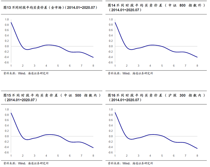 考虑到股票在开盘后与收盘前都具有较高的成交占比,但是开盘后的买卖价差远高于收盘前。因此可以认为股票在开盘后所呈现出的较高的买卖价差体现了股票在开盘后的交易时段中知情交易者较多,具有更强的信息不对称性,而收盘前相对较低的买卖价差则说明该段时间的知情交易者相对较少。