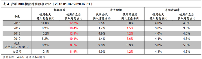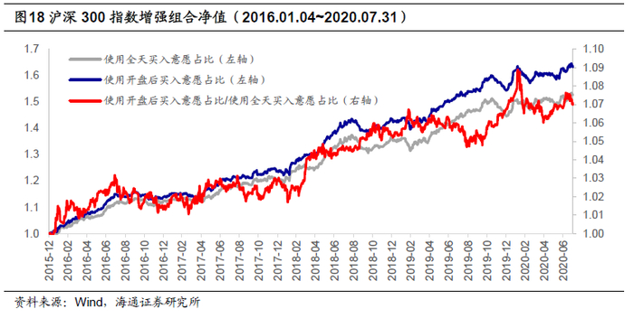 同样可以月度调仓的沪深300指数增强组合为例,在其他各方面相同的情况下,分别在模型中使用全天买入意愿占比以及开盘后买入意愿占比,并观察模型在2016年以来的收益表现。下表对比展示了两模型的收益风险情况。