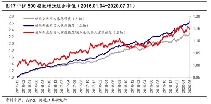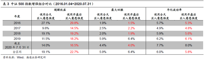 不妨以月度调仓的中证500指数增强组合为例,在其他各方面相同的情况下,分别在模型中使用开盘后买入意愿强度以及全天买入意愿强度,并观察模型在2016年以来的收益表现。下表对比展示了两模型的收益风险情况。