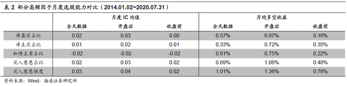 通过对比,我们发现高频因子在使用日内不同时段数据进行计算时,其月度选股能力存在明显差异。根据因子内在逻辑的不同,使用不同时段数据计算得到的因子的月度选股能力也会有所不同。可根据高频因子内在逻辑将其分为两类,一类旨在刻画知情交易者的交易行为,该类因子在使用开盘后30分钟数据计算时具有更强的月度选股能力,而另一类旨在刻画投资者的过度反应,该类因子在使用剔除开盘后30分钟数据计算时的选股能力相对较强。结合海外研究成果以及国内市场微观结构特征,我们认为这一现象与不同时段的投资者构成以及高频因子内在逻辑存在较强联系。