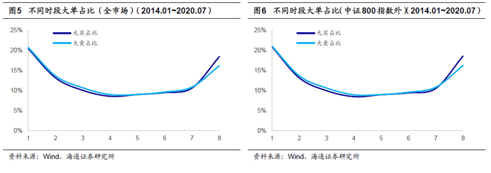 在识别大单时,本文首先基于逐笔成交数据中的买卖单号将逐笔成交数据还原为买卖单数据。其次,考虑到买卖单成交额的分布特征具有极为明显的偏度,故而对于买卖单成交额进行对数处理,并基于对数单成交额的分布设定大单阈值。下图分别展示了全市场、中证800指数外、中证500指数内以及沪深300指数内的股票日内大单的分布情况。(即,各时段大单成交额占全天大单成交额的比例。)