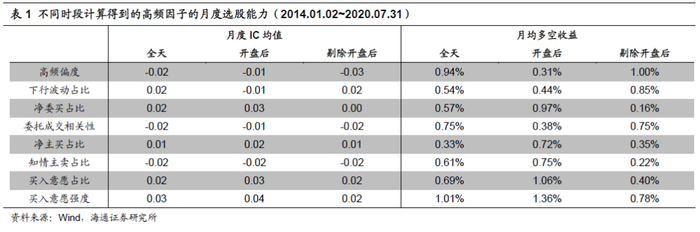 不妨将日内数据(9:30~14:56,后文简称全天)分为两个时段:9:30~9:59(后文简称为开盘后)、10:00~14:56(后文简称为剔除开盘后),并分别使用两个时段的数据计算因子值。下表对比展示了使用不同时段数据计算得到的高频因子的选股能力。(因子具体计算方法可参考前期系列专题报告。)