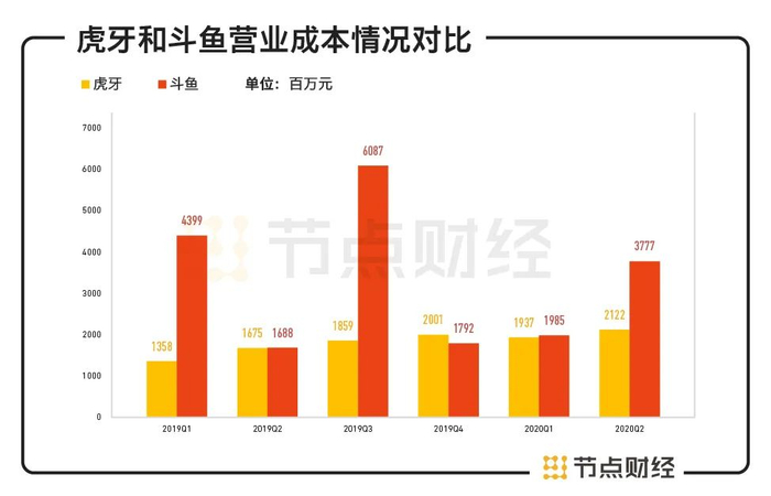 到2020年Q2,斗鱼的营业成本依然高达37.7亿元,同比增长27%;虎牙的营业成本为21.1亿元,同比增长26.7%,约为斗鱼的一半。