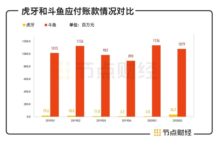 值得注意的是,斗鱼目前的应付账款相对较高。过去六个季度,斗鱼的应付账款一直在8亿到10亿间徘徊。截至2020年Q2,其应付账款高达10.8亿元,虎牙为3470万元。