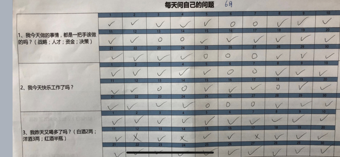 然后结成互助的小小组,秘书跟进,互相监督,定时打卡。东道主廖创宾说:“加入这个小组,你是要探索怎么做一个更好的自己。”他依样画葫芦,在办公室做了一个管理工具,来跟踪自己每一天“有没有快乐工作”。这样跟踪了一年,颇有成效:“以前下属看到我像看到鬼一样,现在每次觉得自己要发火,基本能控制情绪。对方其实都能感受到,现在他们看到我不怎么紧张了。”
