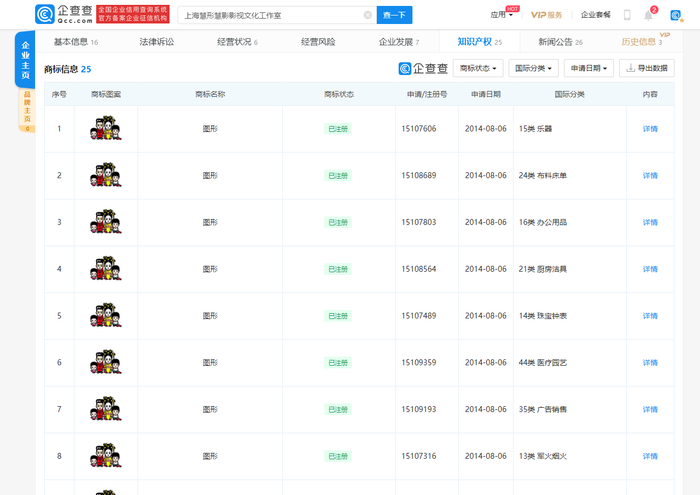新京报贝壳财经讯 企查查APP显示,上海慧形慧影影视文化工作室已成功注册25个全家福动漫logo,皆于2014年申请注册,该公司法定代表人为邓超,成立于2013年。