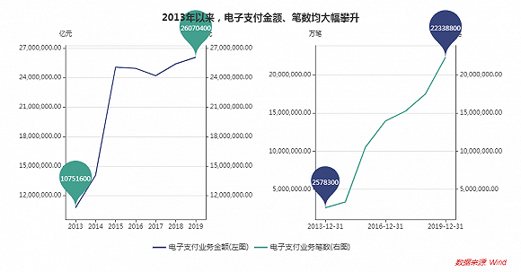 支付方式的发展,趋势是数字化、便捷化。中国人民银行公布的数据显示,2019年,全国银行共办理非现金支付业务43310.19亿笔,金额3779.49万亿元,同比分别增长50.25%和0.29%。当年,电子支付业务同比增长37.14%。移动支付业务同比增长67.57%;2020年2季度,非现金支付业务同比增长6.83%。