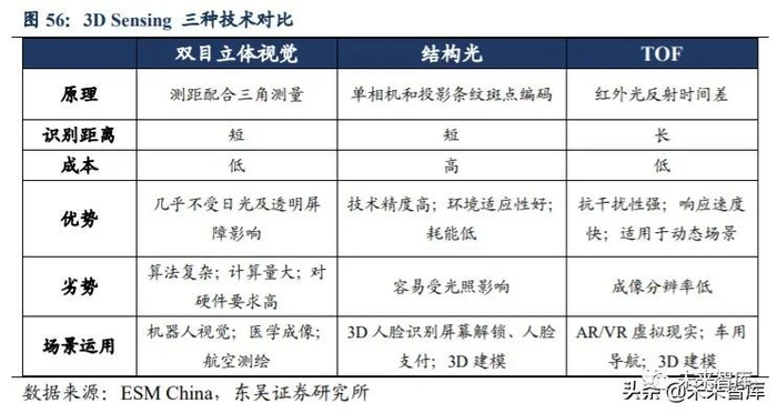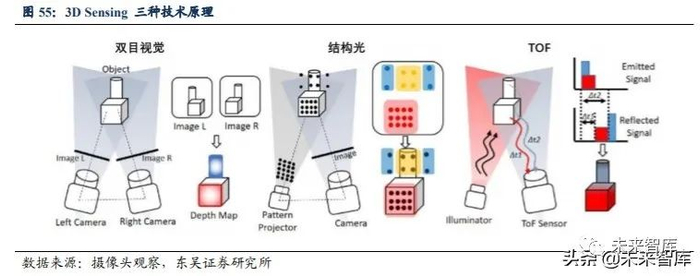 实现 3D Sensing 的技术有三种:双目立体成像、结构光和 TOF。其中结构光技术 最为成熟,已经大规模应用于工业 3D 视觉领域,TOF 则由于自身特性快速在手机等移 动终端加以应用。