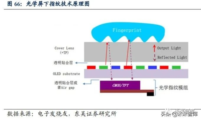 光学屏下指纹有望大规模应用于 LCD。光学屏下指纹目前大部分是用在 OLED 屏 幕上,其原理是当用户按压 OLED 屏幕后,OLED 产生的光线会照射手指纹理,然后光 线再反射到屏幕下的指纹识别传感器上,产生指纹图像,进而与数据库进行对比分析, 最终识别指纹。目前光学屏下指纹识别技术成熟,是屏下指纹识别的主流。智能手机使 用的光学屏下指纹放弃了传统光学系统,改用手机屏幕作为光源,因此自发光的 OELD 屏幕一直是光学屏下指纹的选择。但在 2019 年,LCD 屏下光学指纹方案有所突破。2019 年 4 月底,国内厂商阜时科技展示了 LCD 屏的屏下指纹解锁方案,之后友达宣布推出 全球首款全屏幕光学指纹识别LCD屏幕,同年6月京东方副总裁刘晓东表示京东方LCD 屏下光学指纹感测技术已研发成功。2020 年初,汇顶科技 CEO 张帆表示公司将在今年 实现 LCD 屏下光学指纹方案的量产。