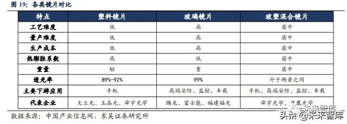 玻塑混合镜片有望成为镜片发展新趋势。摄像头镜片主要分为塑料镜片、玻璃镜片 和玻塑混合镜片。虽然塑料镜片透光率存在一定劣势,但是由于手机镜头需求量大且对 成本要求高,塑料镜片在工艺难度、量产难度、成本等方面优势便体现出来,因此目前 手机镜头多以塑料镜片为主,而手机市场应用占比 80%以上,这也是龙头厂商多集中于 塑料镜片的原因。而在安防车载领域,对镜片透光率要求更高,而对成本相对不敏感, 所以更多使用玻璃镜片。玻塑混合镜片透光率高于塑料镜片,量产难度与成本低于玻璃 镜片,且可应用领域更为广泛,在手机、安防、车载领域均有使用,对于提升相片质量 是较优的选择,因此玻塑混合镜片有望在未来得到广泛应用。