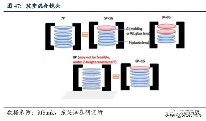玻塑混合镜头突破瓶颈,有望应用于主流高端机型。目前常见的摄像头有塑料镜片 和玻璃镜片,塑料镜片成本低、易批量生产,成为手机镜头的主流,但其成像清晰度有 限,失真率过高,难以跟上目前手机摄像头超高像素趋势。玻璃镜片性能更好,但其量 产难度大,生产成本高,难以在手机领域广泛应用。为了让图像更加清晰真实,目前已 发展到 8P 镜头,但镜片太多,镜头厚度会相应增加,不利于手机轻薄化,而且塑料镜 片清晰度有限,太多塑料镜片也会提高失真率,此时玻塑混合镜片的出现突破了性能瓶 颈。玻塑混合镜头将塑料镜片和玻璃镜片混合使用,成像清晰度比塑料镜片高,成本也 介于塑料镜片与玻璃镜片之间,6 片塑料镜片+1 片玻璃镜片组成的玻塑混合镜头成像效 果与 8 片塑料镜片相当,但其镜片数少,镜头厚度有所改善,所以玻塑混合镜头有望应 用于主流旗舰机型。