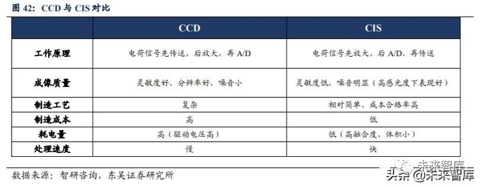 高像素时代下,CIS 为摄像头行业首选。成像过程中,手机镜头先捕捉画面,转化 成电信号,再由图像传感器将电信号转化成数字信号,经过 DSP 处理后,再形成图片, 图像传感器在其中的作用至关重要。图像传感器可分为 CCD(电荷耦合器件)和 CMOS (互补金属氧化物半导体)传感器(CIS)两种。CCD 灵敏度高、分辨率高、噪音小, 但是 CIS 能耗低、体积小、重量轻、集成度高、价格低,而且经过像素与 CMOS 的迭 代升级,在高感光度下也能有很好的成像质量,所以 CIS 已成为摄像头首选方案。