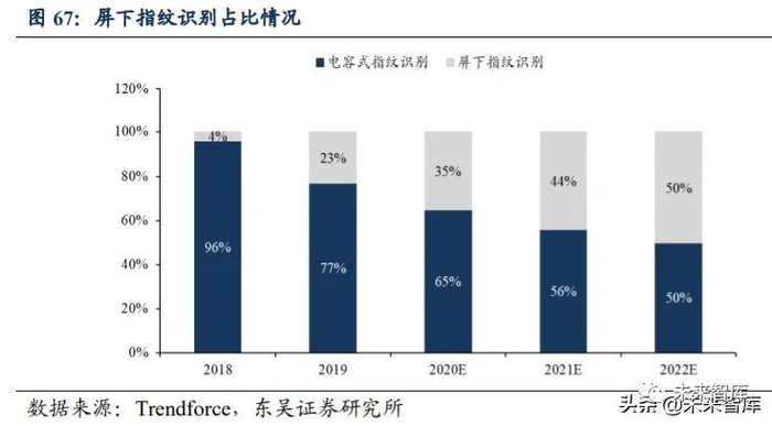 屏下指纹识别应用规模显著扩大。以智能手机为例,智能手机呈现全面屏趋势, 若采用电容式指纹识别方式,会造成手机设备外观的影响,近年来传统电容式指纹识 别方式在手机上的应用占比快速下降,屏下指纹识别占比不断提升。根据 Trendforce 数据,2018 年屏下指纹识别在指纹识别中的占比仅为 4%,2019 年上升至 23%,到 2022 年有望达到 50%。