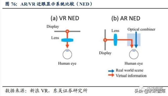 微型显示器和光学元件组合是 AR 眼镜成像关键。一般来说,对于 AR/VR 等智能 眼镜的硬件部分由近眼显示(NED)、应用处理系统(AP)、外观设计等构成,其中近眼 显示(Near-eye Display,简称 NED)是 AR/VR 硬件设备的核心所在,旨在将显示器上的像 素通过光学元件成像,形成虚像并投射在人眼中。其中,AR 相比于直接显示虚拟图像 的 VR 技术来说,因其成像系统不能挡在视线前方,需要实现透视,所以需要多加一组 光学组合器以“层叠”的形式,将虚拟信息和真实场景融为一体。目前,AR 眼镜的显 示系统多为包括 LCOS、LBS、Micro OLED 等微型显示屏和棱镜、自由曲面、光波导、 Birdbath 等光学元件的组合,这些光学元件是决定 AR 眼镜成像效果的关键。