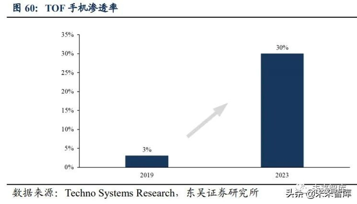 5G 时代搭载 TOF 镜头将成为未来趋势。从人脸识别到 AR/VR 虚拟现实,TOF 有望接力结构光,带来手机产业的全新升级,前置人脸识别+后置虚拟现实功能可能成为 手机下一个发展趋势。对手机来说,TOF 比结构光更适合于 3D 视觉成像技术。TOF 前 置镜头也能应用于面部识别解锁,加上 TOF 自身的优良特性,用户体验好,而且 TOF 成本较低,应用范围更广,更为手机厂商所青睐,越来越多的厂商开始尝试后置摄像头 TOF 方案。5G 商用为手机 3D 视觉的应用迎来新的发展机遇。在 5G 技术的支持下,TOF 镜头将会逐步运用以满足 VR/AR 游戏场景等需求,5G 时代搭载 TOF 镜头将成为趋势。根据 Techno Systems Research 数据,2019 年采用 TOF 的智能手机渗透率为 3%,到 2023 年渗透率有望突破 30%,成为中高端机型的标配。