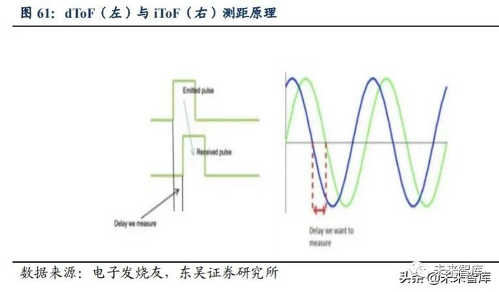 iTOF 和 dTOF 原理各不相同。激光雷达发射的光波存在两种调制方式:直接飞 行时间(dToF)测量和间接飞行时间(iToF)测量,dToF 和 iToF 的原理区别主要在 于发射和反射光的区别。dToF 即直接发射一个光脉冲,之后测量反射光脉冲和发射光 脉冲之间的时间间隔,就可以得到光的飞行时间。而 iToF 发射的并非一个光脉冲,而 是调制过的光,由于接收到的反射调制光和发射的调制光之间存在相位差,通过检测 该相位差就能测量出飞行时间,从而估计出距离。