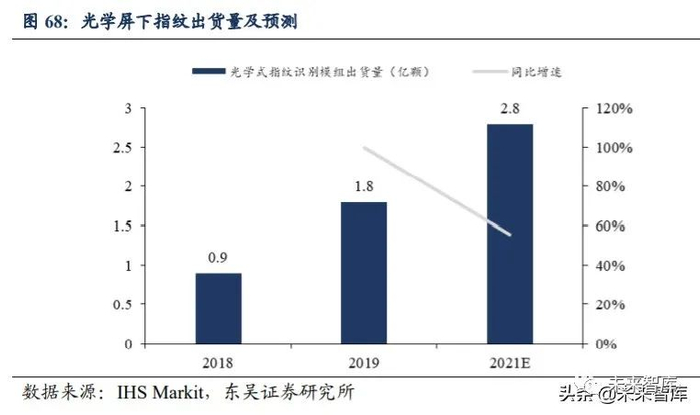 全面屏需求驱动光学指纹渗透率提升。目前,光学指纹识别产业链成熟,供应商数 量较多。光学式屏下指纹识别凭借其技术优势、成熟的供应链和良好的用户体验,取得 了大部分的市场份额。根据 Trendforce 数据,2019 年屏下指纹识别中,光学占 82%,超 声波占 18%。当下,全面屏手机已经成为智能手机选择的主流,随着光学屏下指纹识别 技术的进一步成熟,成本会快速下降,运用光学屏下指纹方案的手机厂商会逐步增多。同时,随着 2020 年 LCD 屏下指纹识别方案量产,光学屏下指纹技术将会下沉到千元机 的市场,渗透率将会得到快速提升。根据 IHS Markit 数据,2019 年光学式指纹识别模 组的出货量为 1.8 亿颗,2021 年出货量有望超过 2.8 亿颗。