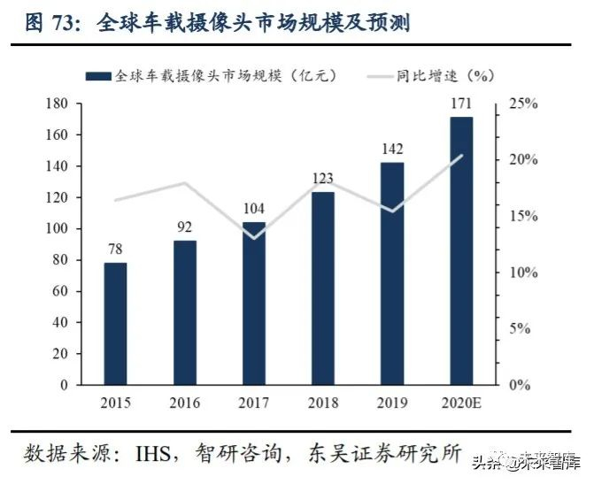 智能驾驶将驱动车载镜头需求增长。一般来说,ADAS 系统功能完整实现需要单车 配备至少 6 个摄像头,随着自动驾驶化程度提升,将驱使车载摄像头数量增长。目前特 斯拉 Autopilot2.0 使用 8 颗摄像头,其中包括 3 个前视、3 个后视及 2 个侧视,索尼首次 对外公布的智能汽车产品“VISION-S”在车身内外嵌入 33 个传感器,其中包括 12 个车 载摄像头,为驾驶者提供全景影像,以全方位保证车辆行驶安全。自动驾驶技术将有效 促进驾驶安全,美国、日本等多国政府鼓励安装 ADAS 系统,进而加速 ADAS 技术渗 透,车载摄像头需求将保持强劲,加之汽车市场规模基数较大,车载镜头市场规模将进 一步提升。根据 IHS 及智研咨询数据, 2014-2020 年,全球车载摄像头出货量将从 2800 万枚增长到 8277 万枚,CAGR 将达到 16.75%,2015-2020 年,车载摄像头市场规模将 从 78 亿元增长到 171 亿元,CAGR 为 13.98%。