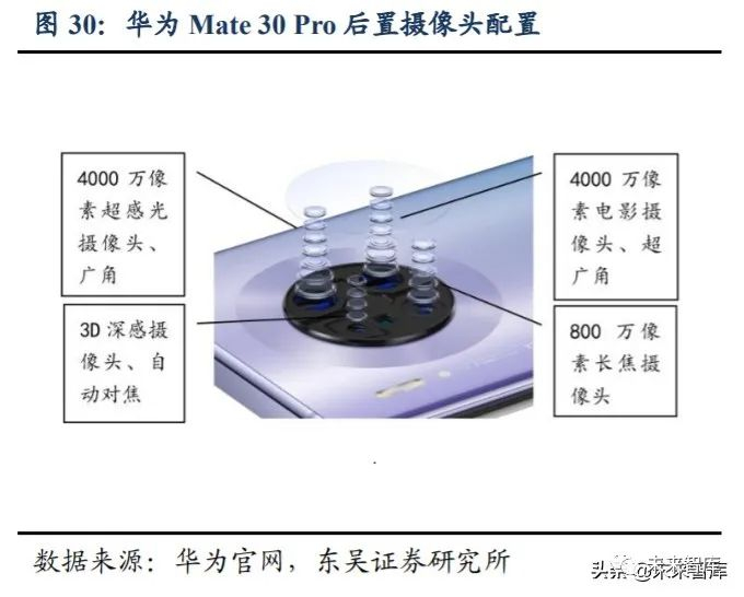 光学升级,旋律不断。随着移动互联网和智能手机兴起,QQ、微信、短视频、直 播等应用在消费者当中持续渗透,人们利用手机拍照、录制视频并进行分享等相关活动 也愈加频繁,消费者也展现了对手机拍照性能的持续追求,具体体现在图片色彩丰满度、 照片清晰度、取景广度、成像立体感、镜头变焦能力等各个方面,手机厂商也将光学升 级做为重要创新领域。厂商开始为手机搭载多个性能不同的镜头来提升拍照性能全面 性,如搭载 TOF 镜头提升立体感、搭载超广角镜头提升空间感等,通过提高单个镜头 的像素、增加单个镜头镜片数来提升单镜头清晰度,研发潜望式镜头来以突破因为手机 体积,镜头进行光学变焦的限制。2019 年,苹果推出性能参数为“前置 12MP+后置 12MP 广角主摄+12MP 长焦镜头+12MP 超广角镜头”的 iPhone 11 Pro Max,华为也推出性能参 数为“前置像素 32、后置 40MP 超广角主摄+40MP 超广角+8MP 长焦+TOF 深感摄像头” 的 Mate 30 Pro,我们认为,光学升级不会停止,多摄趋势、单镜头升级、潜望式镜头变 焦以及 TOF 镜头的应用将成为光学赛道持续景气的主要动力。