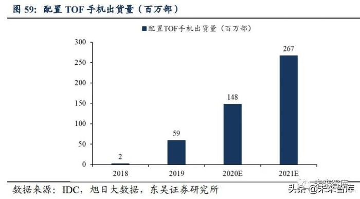 苹果发布 TOF 新机将推动 TOF 技术应用进程。根据 DigiTimes 报告,2020 年发布 的 iPhone 将搭载 ToF 传感器。近期受新冠疫情影响,手机终端及供应商上下游市场遭 受重创,手机市场出货量衰退,TOF 订单也由此受到影响。但对 TOF 市场而言,随着 下半年苹果发布 TOF 新机,TOF 技术应用将迎来拐点,苹果在手机市场上具有重要的 地位,后期的 TOF 应用将会受苹果影响变得更加成熟和普及。根据 IDC 和旭日大数据 的预测,预计 2020 年配置 TOF 的手机出货量有望达到 1.48 亿部,2021 年将达到 2.67 亿部。