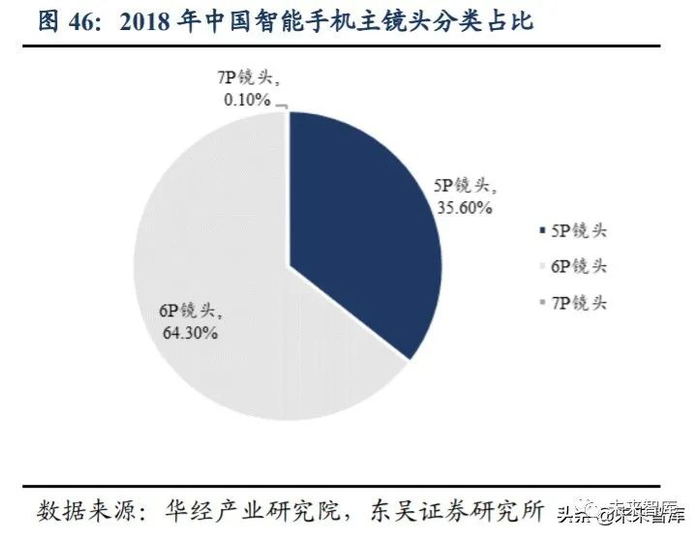 镜片数逐步拉升,6P 向 7P、8P 演进。当光线通过镜头的镜片时,镜片可以过滤杂 光,镜头片数提升,图像对比度与解析度越高,成像越清晰、真实;另外,受限于手机 摄像头模组体积,镜头移动范围与焦距较短,可利用多镜片镜头去模拟超短焦距的镜头, 为了优化成像效果,镜头将有望从目前主流的 6P 镜头向 7P、8P 镜头演进。根据华经产 业研究院数据,2018 年中国智能手机中,35.6%的智能手机主摄像头镜片为 5P 镜头, 64.3%的手机主摄为 6P 镜头,0.1%的手机主摄为 7P 镜头。2018 年推出的 OPPO R17 Pro、 2019 年推出的小米 9 透明探索版、华为 P30 Pro 等都已搭载 7P 镜头,2019 年小米发布 的 CC9 Pro 还是首款使用 8P 镜头的手机。