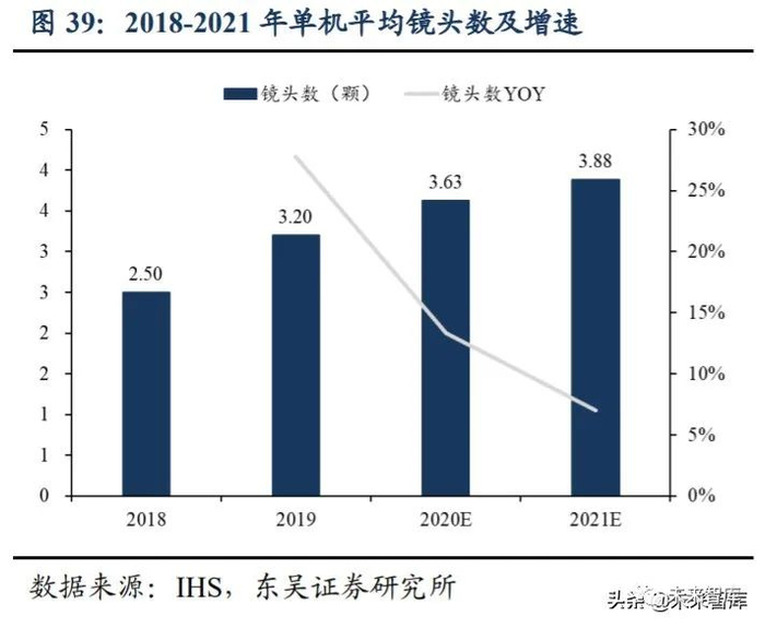 手机存量市场下,光学升级推动镜头需求量稳定增长。根据 IHS 数据,2018-2021 年,全球智能手机出货量将从 14.17 亿部增长至 14.56 亿部,CAGR 为 0.91%;全球智 能手机镜头需求量将从 35.47 亿颗升至 56.50 亿颗,CAGR 为 16.79%。经过我们计算, 平均每部智能手机镜头数将从 2.50 颗升至 3.88 颗,CAGR 为 15.78%,说明在人口红利 消失,手机进入存量时代下,单机平均镜头数仍然将保持稳健增长,手机多摄增加已然 成为趋势。