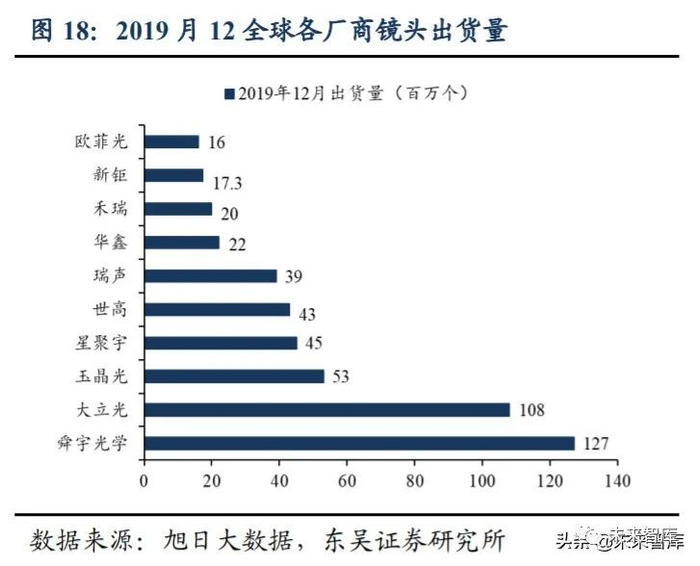 镜头市场集中度高,龙头厂商出货量绝对领先。根据中国产业信息网数据,2018 年 CR3 为 54%,大立光占比 35%,舜宇光学占比 10%,玉晶光占比 9%。根据旭日大数 据的数据,从出货量上可以看出,201912 单月出货量上亿的仅有大立光和舜宇光学,二 者处于行业绝对领先地位。