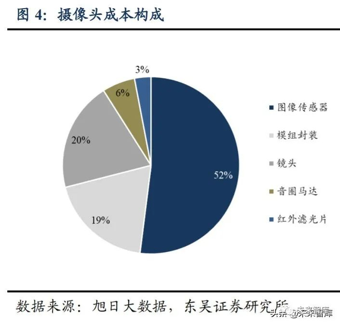 摄像头主要由五部分组成。根据旭日大数据,摄像头各组成部分功能及成本占比各 不相同,主要包括图像传感器(将表面的上镜头送过来的光信号转化成为电信号),在 摄像头组件成本中占比 52%;镜头(收集光线然后将物体成像到图像传感器),在摄像 头组件成本中占比 20%;音圈马达(推动镜头移动实现对焦,通过移动镜头可以得到清 晰的照片),在摄像头组件成本中占比 6%;红外截止滤光片(过滤多余的红外光和紫外 光,使得拍摄出来的图像颜色更加接近我们人眼所看到的颜色),在摄像头组件成本中 占比 3%;以及最终的模组封装(将摄像头零组件整合到一起成为完整的摄像头),在摄 像头成本中占比 19%。