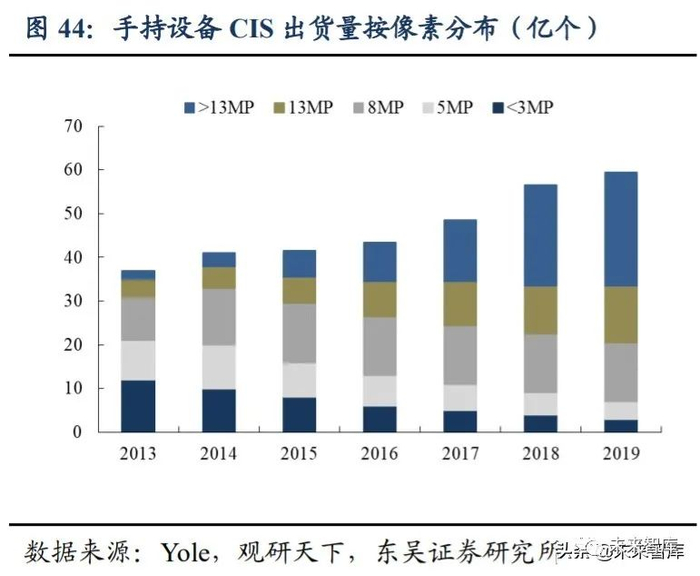 高像素 CIS 出货量激增。随着高像素镜头用量增加,与之匹配的高像素 CIS 出货量 也同步上升,根据 Yole 及观研天下数据,2013-2019 年,5MP 及以下的 CIS 出货量自 21 亿个降至 7 亿个,13MP 像素及以上的 CIS 出货量自 6 亿个大幅增长至 39 亿个,高 像素 CIS 出货量迅速提升。