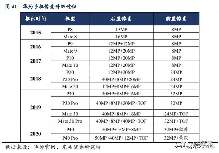 像素是手机厂商镜头升级的重要方向。像素是摄影的基础,像素越高,照片分辨率 就越大,镜头对画面的解析能力就越强。根据 Yole 数据,2017 年$200 以上价位的手机 中,8-13MP、13-20MP 像素的摄像头成为主流,两者占比合计达到 90%,手机千万像 素成为普遍现象。2015-2019 年,华为手机前置、后置像素同步升级,前置主摄像素自 8MP 升至 32MP,后置主摄像素自 13MP 升至 40MP,2019 年推出的 Mate 30 Pro 搭载前置 32MP,后置广角双 40MP+长焦 8MP+TOF 四摄镜头,而小米新推出的 CC9 Pro 前置 像素达到 32MP,后置主摄像素达到 108MP,像素成为手机的重要卖点,也是手机的关 键参数,未来升级化趋势不可避免。