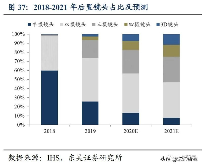 前置 3D 摄像有望增加。根据 IHS 数据,2018-2021 年,前置单摄镜头、双摄镜头 出货量基本稳定不变,而 3D 镜头出货量将 0.85 亿颗增长 2.7 亿颗,其占比也由 5.65% 升至 15.64%。