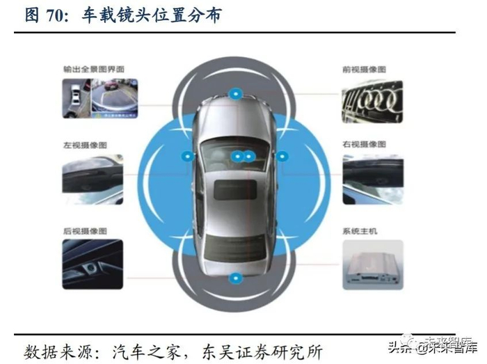 车载摄像头应用广泛。光学镜头在汽车领域应用广泛,摄像头可将外部环境中车辆、 行人、道路标志等相关信息进行及时反馈。自 2012 年以来,车载摄像头应用进入快速 成长阶段,如车载摄像头取代后视镜,在座舱内通过液晶显示屏同步显示车身周围环境, 保证安全驾驶。车载摄像头配合雷达、红外线等构成汽车辅助驾驶系统,包括倒车辅助 影响,行车监控录像等,为驾驶者提供更为全面的安全保障