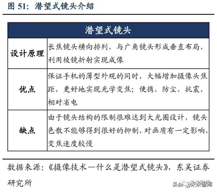潜望式镜头实现高倍清晰变焦。潜望式镜头是将长焦镜头横向排列,与广角镜头形 成垂直布局,利用棱镜折射实现成像,能够在保证手机薄型外观的同时,大幅增加摄像 头焦距,但镜头色散抑制是难点,这就对棱镜的折射透光率、摆放精度要求非常高。