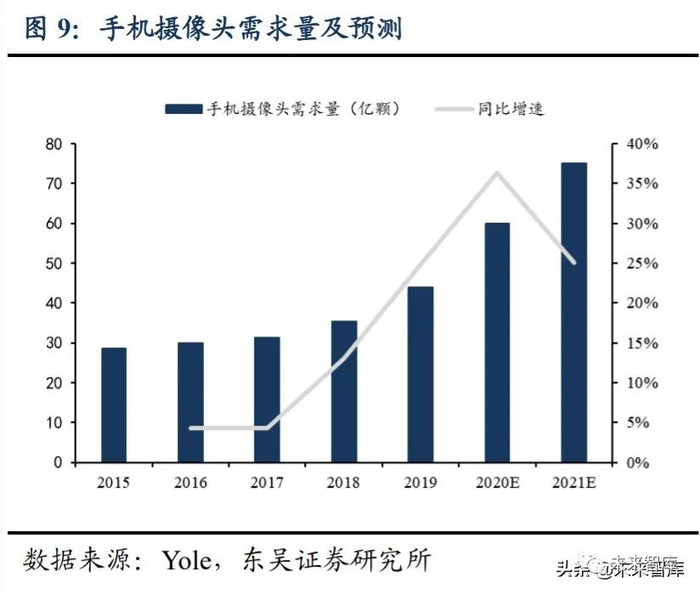 手机摄像头市场规模及需求量齐升。根据中国产业信息网数据,2018-2024 年,手 机摄像头行业规模预计将从 271 亿美元增长到 457 亿美元,CAGR 为 7.75%;根据 Yole 数据,手机摄像头出货量也将不断增长,2019 年出货量为 44 亿颗,预计 2021 年达到 75 亿颗。