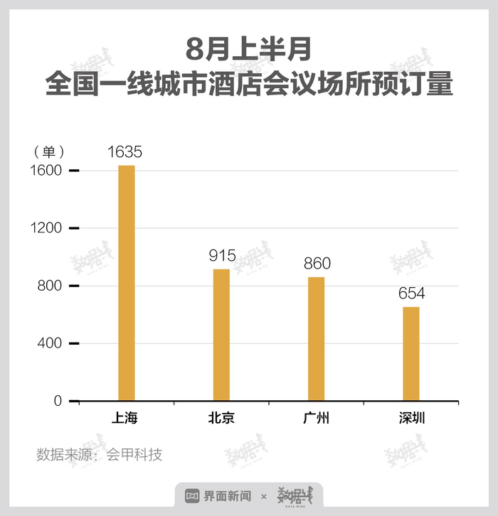 对比全国其他一线城市,上海市的商务活动恢复情况也排在前列。会甲科技表示,8月上半月,平台上共有1635个上海会议订单,和全国其他城市相比处于领先,如北京同期订单量为915条,广州为860条,深圳654条。