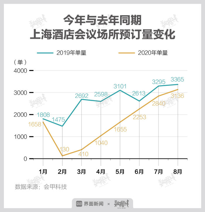 全国会场搜索预订平台运营商会甲科技告诉界面新闻,受疫情影响,今年2、3月份,上海酒店会议场所在该平台上的预订量跌到谷底,4月以后开始呈现出逐月递增的趋势,从每月1000多单增长至8月的3136单。