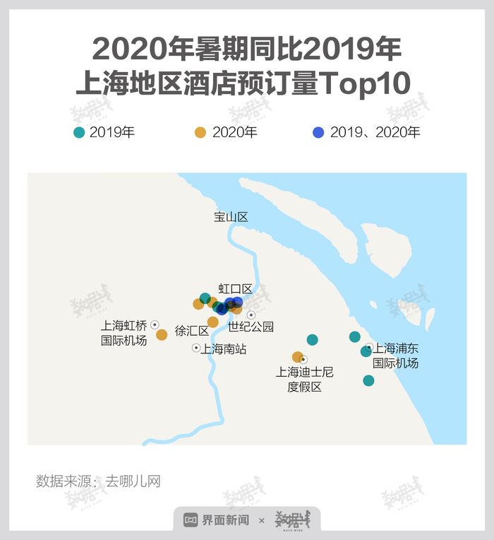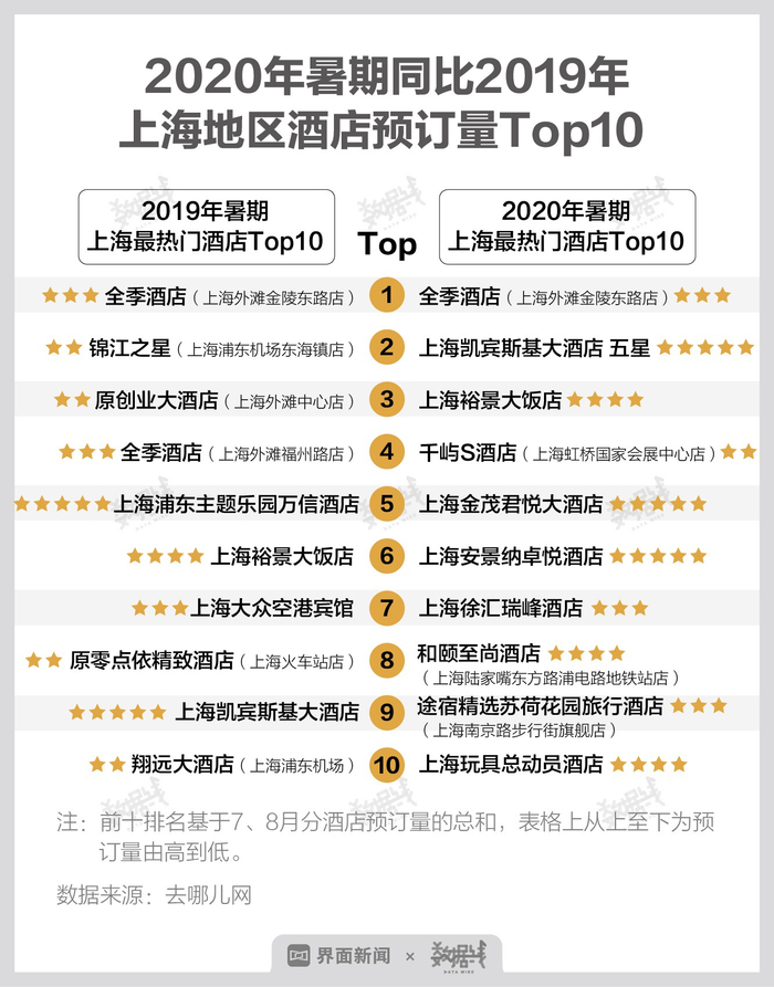 另外,对比分析去哪网平台上2019年和2020年7、8月份预订量最火的前十家上海酒店,可以看出上海酒店消费行为在疫情后出现了一系列变化。
