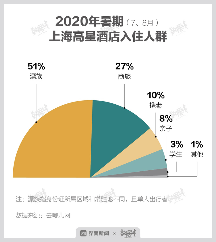 从去哪儿网的数据看,今年暑期前往上海的游客中,单人出行占比51%,商旅出行占比22%,偕老用户10%,亲子用户8%。