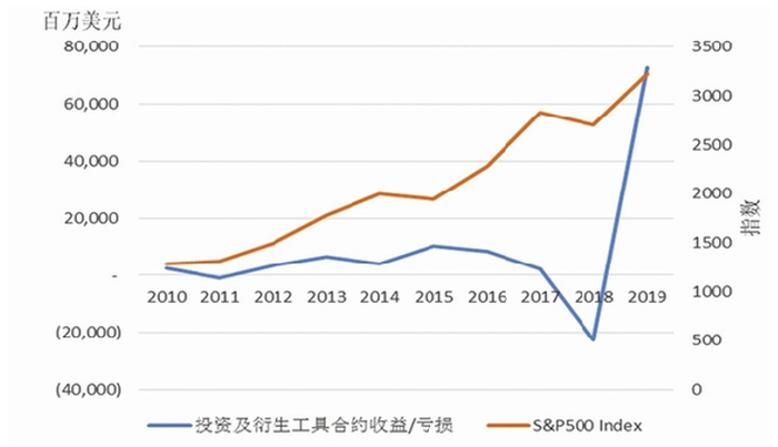 图3 2010-2019年伯克希尔投资及衍生工具合约收益/亏损走势与标普500指数对比