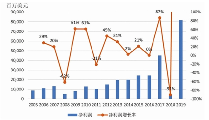 图4中值得特别注意的是2017的增长率。2017年净利润增幅较2016年达87%,从240亿美元增至449亿美元,其中的291亿美元来自一次性减税政策调整(2017年12月22日发布的Tax Cuts and Jobs Act of 2017,即“TCJA”),如果剔除这一影响,2017年的净利润实际是负增长的(-34%)。