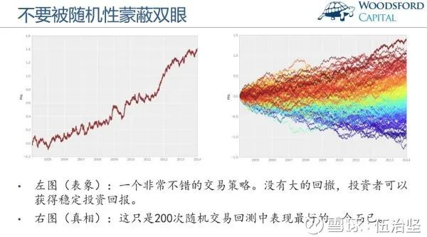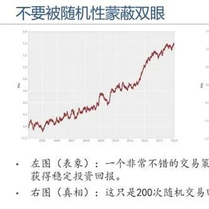 但事实的真相却如右图所示,研究人员只是做了200次随机回测,然后从中挑选出一个表现最好的策略而已。这所有200个交易策略都是随机产生的,因此其未来的投资回报完全不可能重复,其实投资者接下来的投资回报和左图一样的概率几乎为零。